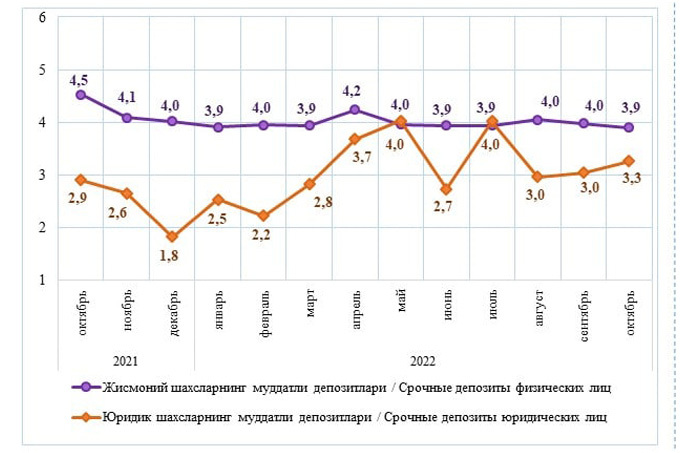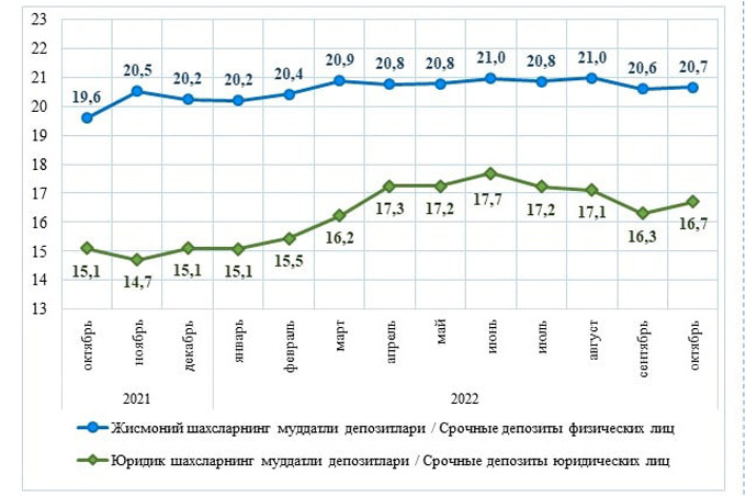 На фоне замедления роста доходности вкладов сократился и прирост средств на счетах населения. За 8 месяцев их сумма увеличилась только на четверть — против 45%, отмечавшихся в 2021 году. В сентябре отмечался общий отток на 700 млрд сумов.