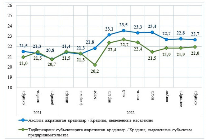 Проценты по займам для граждан за сентябрь увеличились до 22,8%, но затем вновь опустились к 22,7%, отмеченным в августе. Тем временем кредиты для бизнеса в октябре стали ещё немного дороже — 22%.