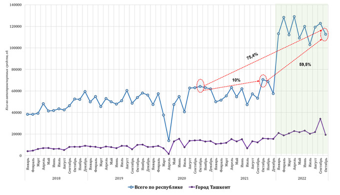 В октябре было зарегистрировано 112,7 тысяч сделок с легковым автотранспортом. По отношению к сентябрьскому уровню рынок упал на 8%, а число сделок в Ташкенте после нового рекорда в прошлом месяце сократилось почти двукратно.