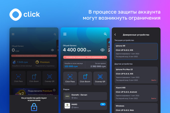 Проходя идентификацию, пользователь закрепляет за своим аккаунтом свои биометрические данные — лицо пользователя, Ф.И.О., и другие данные, которые сверяются с информацией, имеющейся в государственной базе биометрических данных. После, личность пользователя становится идентифицированной в Click и теперь, если злоумышленник завладеет аккаунтом с чужого устройства, попытается вывести деньги или поменять Pin-код — включится защитный режим, который заблокирует подобные действия.
