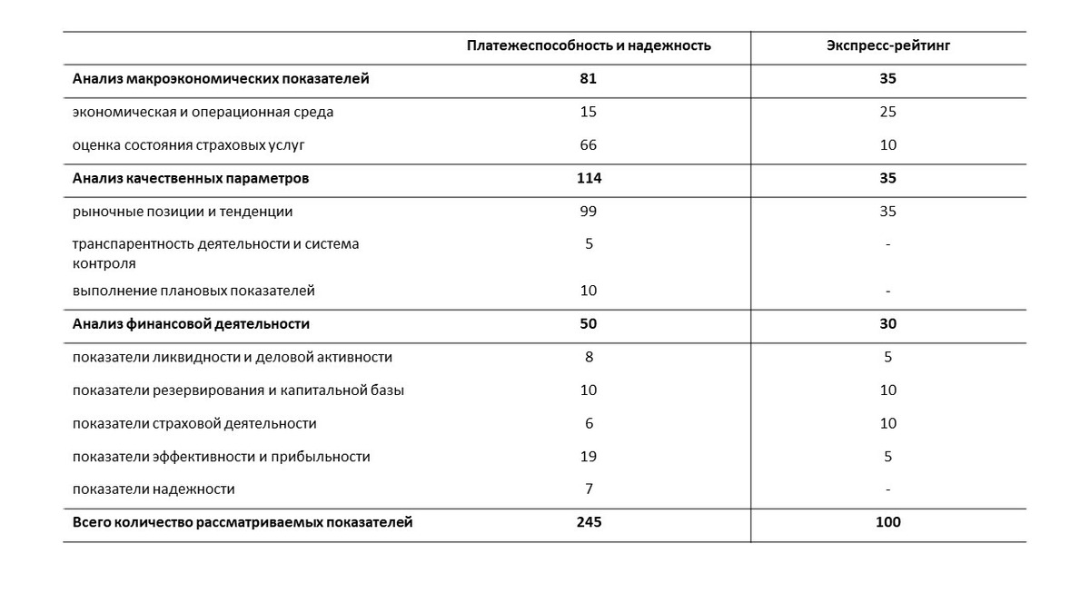 У РА SNS Ratings существуют два вида рейтингового анализа для страховых компаний. Полноценный анализ — рейтинг платежеспособности и надежности и краткий анализ — экспресс-рейтинг. Главной целью рейтингового анализа является отслеживание динамики значимых показателей финансового состояния компании и сравнение их реальных значений с нормативами. Если глубокий анализ дает возможность изучить и оценить эффективность деятельности по 250 показателям, то экспресс-анализ позволяет определить положение дел при рассмотрении лишь по 100 показателям.