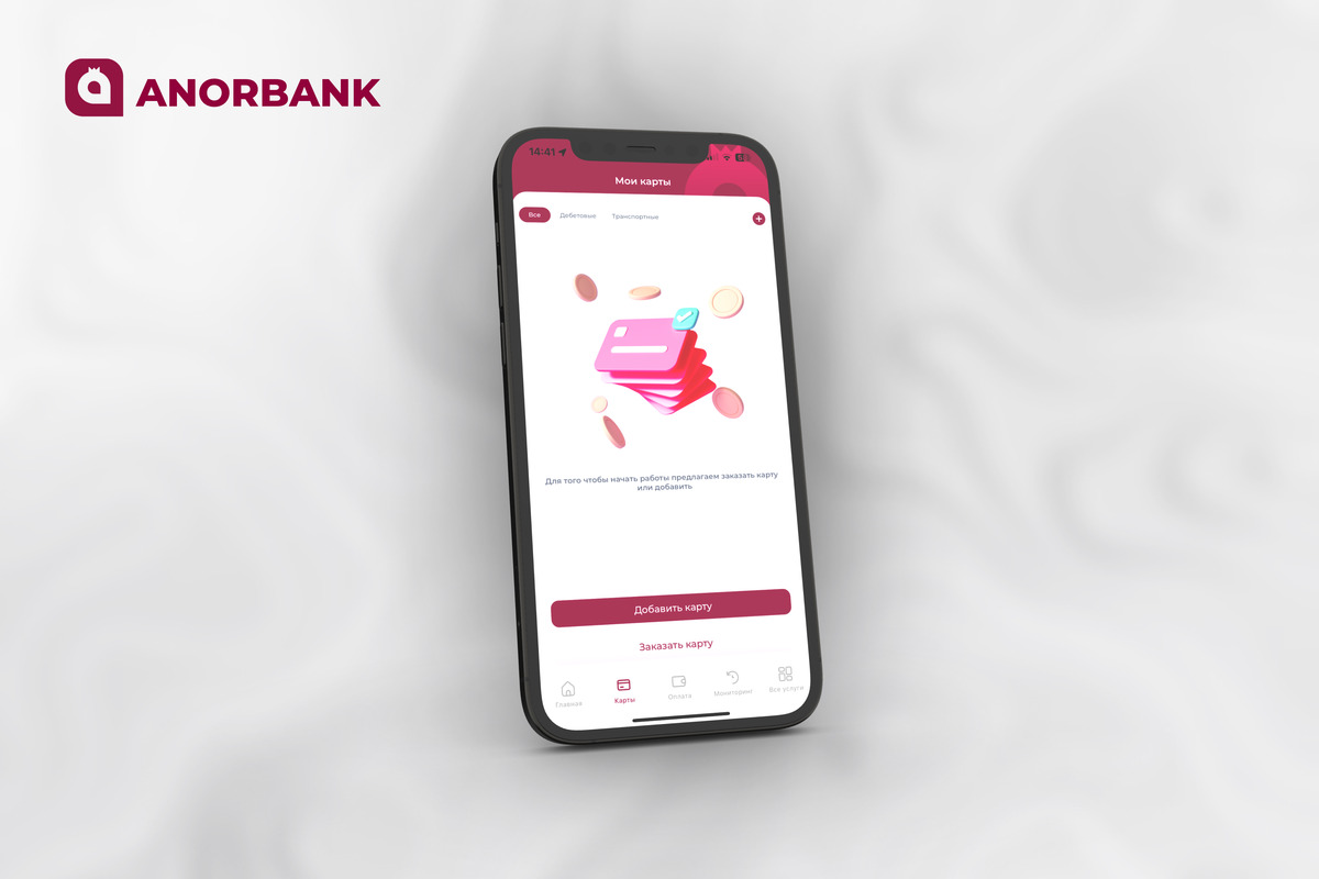 Клиенты банка легко и быстро могут открыть как физическую, так и виртуальную банковскую карту в приложении, а также привязать существующие карты ANORBANK.
