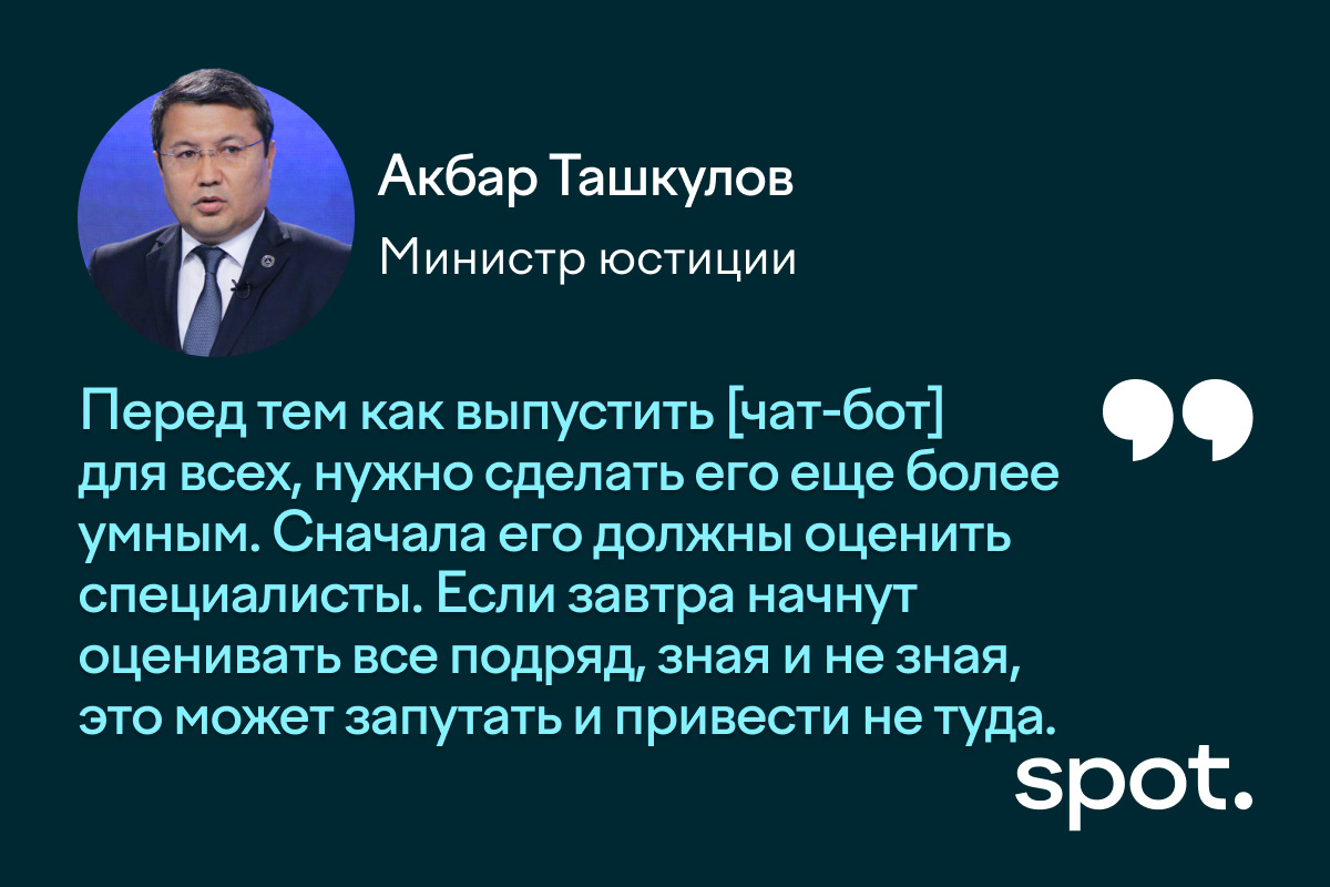На презентации министр юстиции Акбар Ташкулов задал боту вопрос: «Сейчас 18:15 вечера, мы все еще на работе. Является ли наше действие законным?». Чат-бот ответил, сославшись на 139-ю статью Трудового кодекса, и предложил рассмотреть следующий вопрос: Какая предусмотрена компенсация за сверхурочную работу?
