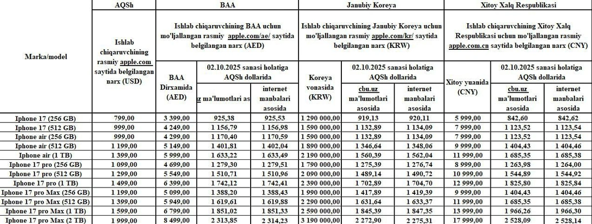 Таможенный комитет привел таблицу со сравнением цен на аппараты в трех странах, откуда в Узбекистан часто ввозят телефоны. Из нее следует, что: