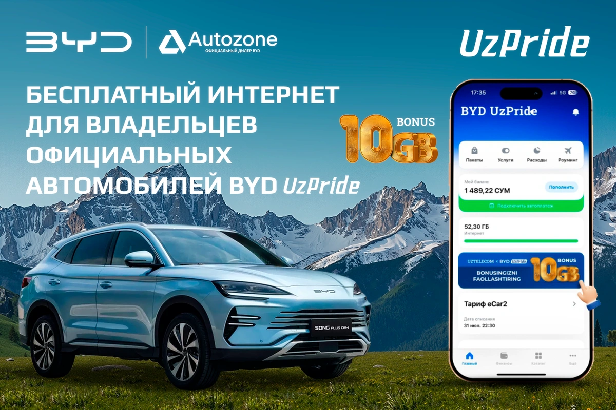 В рамках расширения клиентского сервиса и развития цифровых решений компания BYD заключила стратегическое партнёрство с национальным оператором связи UZTELECOM. Теперь, приобретая автомобиль BYD Song Plus DM-i UzPride у официального дилера BYD Autozone владельцы получают эксклюзивный интернет-бонус — 10 ГБ бесплатного мобильного трафика в месяц в течение первых трёх месяцев эксплуатации автомобиля.