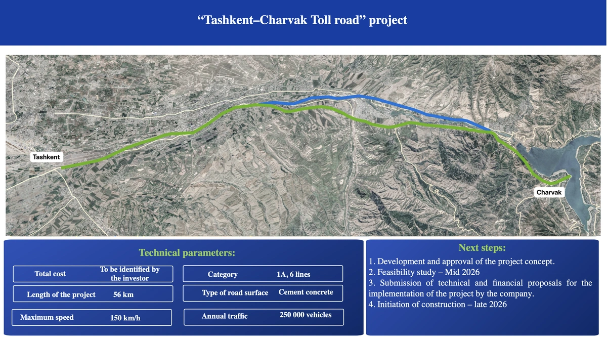 На данный момент ожидается разработка и одобрение концепции проекта. Технико-экономическое обоснование предполагается разработать к середине 2026 года. Затем компания-победитель тендера должна представить технические и финансовые предложения по реализации проекта. Начало строительства платной дороги между Ташкентом и Чарваком запланировано на конец следующего года.