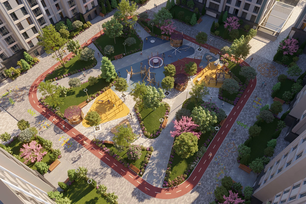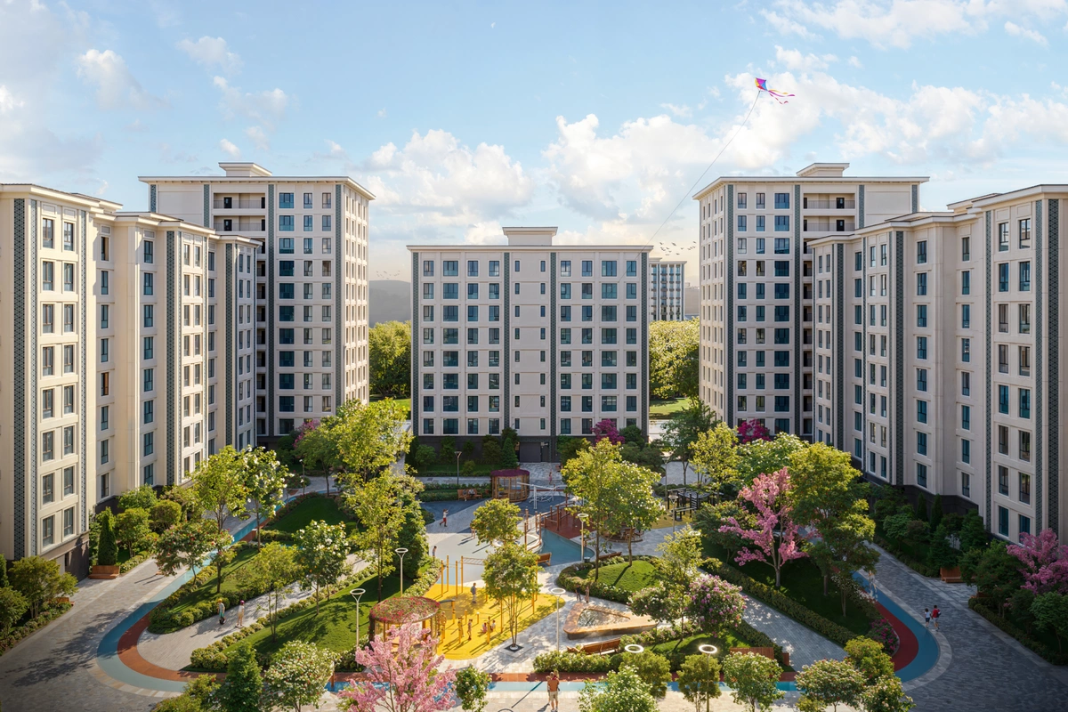 Проект включает 13 879 квартир площадью от 54 кв. м до 137 кв. м, предлагая варианты от двух до четырех комнат. Начиная со второго этажа обеспечена высота потолков 3,30 м, а в оконных системах используются высококачественные материалы немецких стандартов. Внутри квартир применены ламинат для жилых зон и керамическая плитка для влажных помещений, создавая современную, светлую и функциональную среду.