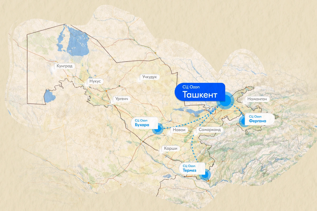 В Ташкенте действует сортировочный центр (СЦ) Ozon площадью 1 тыс. кв. м — технологичный хаб, где принимают товары, упаковывают и отправляют дальше по стране. Объект планируют расширить до 5 тыс. кв. м. Аналогичные логистические центры появятся в Фергане, Бухаре и Термезе.
