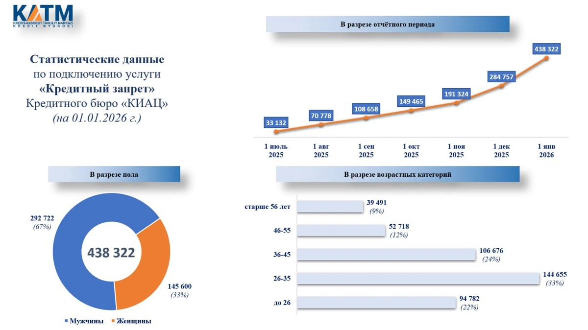 На 1 января 438 322 физических лица подключились к бесплатной услуге по установлению самозапрета на предоставление кредитов. В гендерном разрезе наблюдается явное преобладание мужчин — свыше 292,7 тыс., тогда как женщины составляют 145,6 тыс. пользователей услуги.
