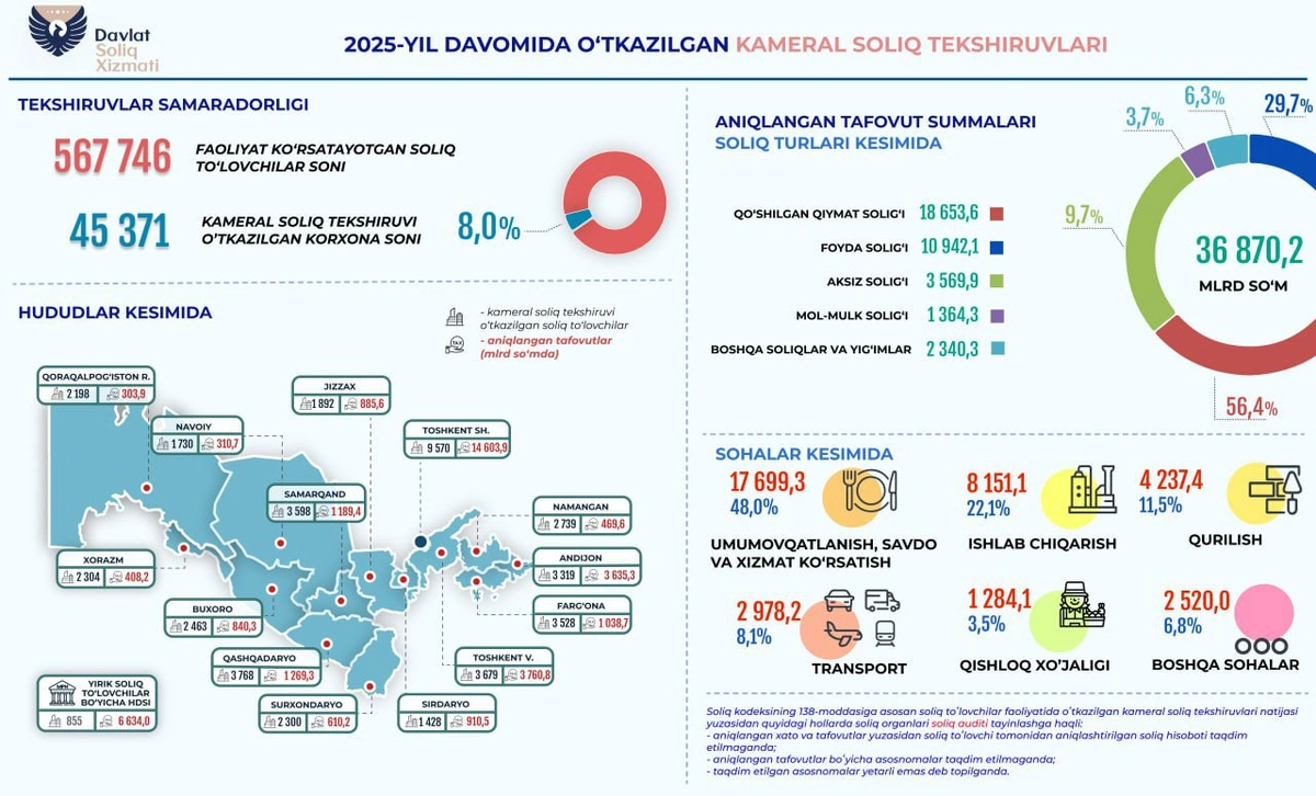 В отраслевом разрезе наибольшие расхождения зафиксированы в сфере общественного питания, торговли и оказания услуг — 17,7 трлн сумов (рост в 2,11 раза). В производстве объем расхождений составил 8,1 трлн сумов (рост в 3,15 раза), в строительстве — 4,2 трлн (+72,1%), в транспорте — 2,9 трлн (рост в 4,44 раза), в сельском хозяйстве — 1,2 трлн (+57,8%).