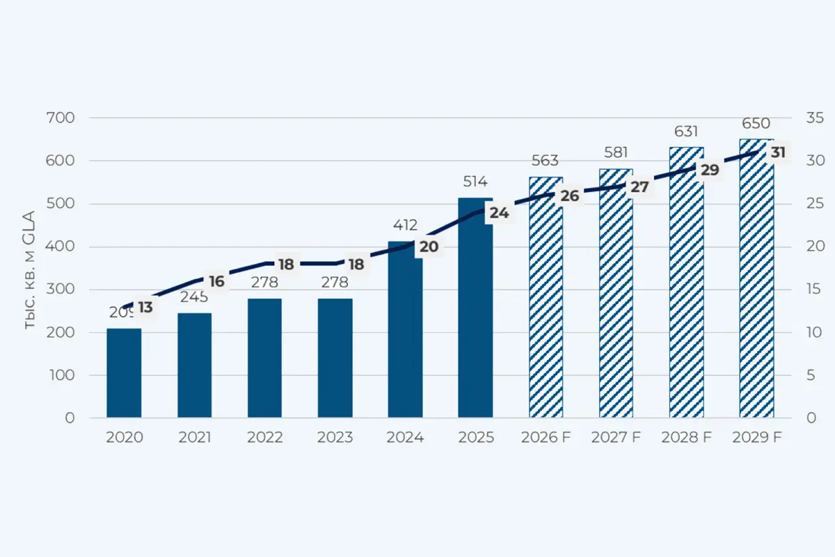 В 2025 году предложение заметно выросло: в городе появилось более 100 тыс. кв.м. новых площадей, включая несколько крупных проектов.