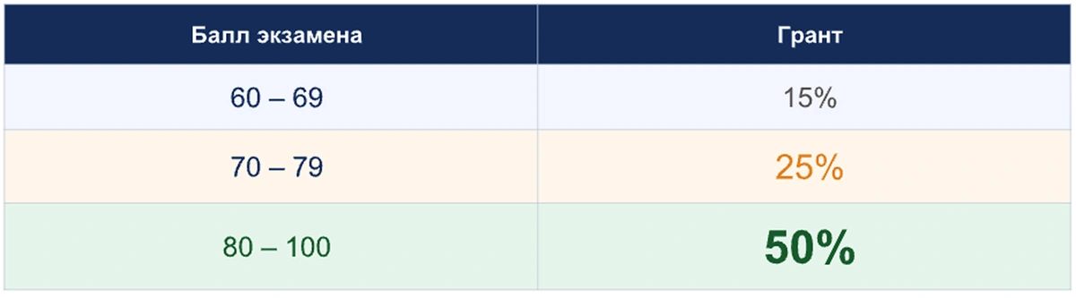 Программа Academic Grant работает по простому принципу: академический результат конвертируется в финансовую поддержку. Никакого конкурса эссе, никаких собеседований — только балл. Размер гранта фиксируется в договоре до первого дня обучения.