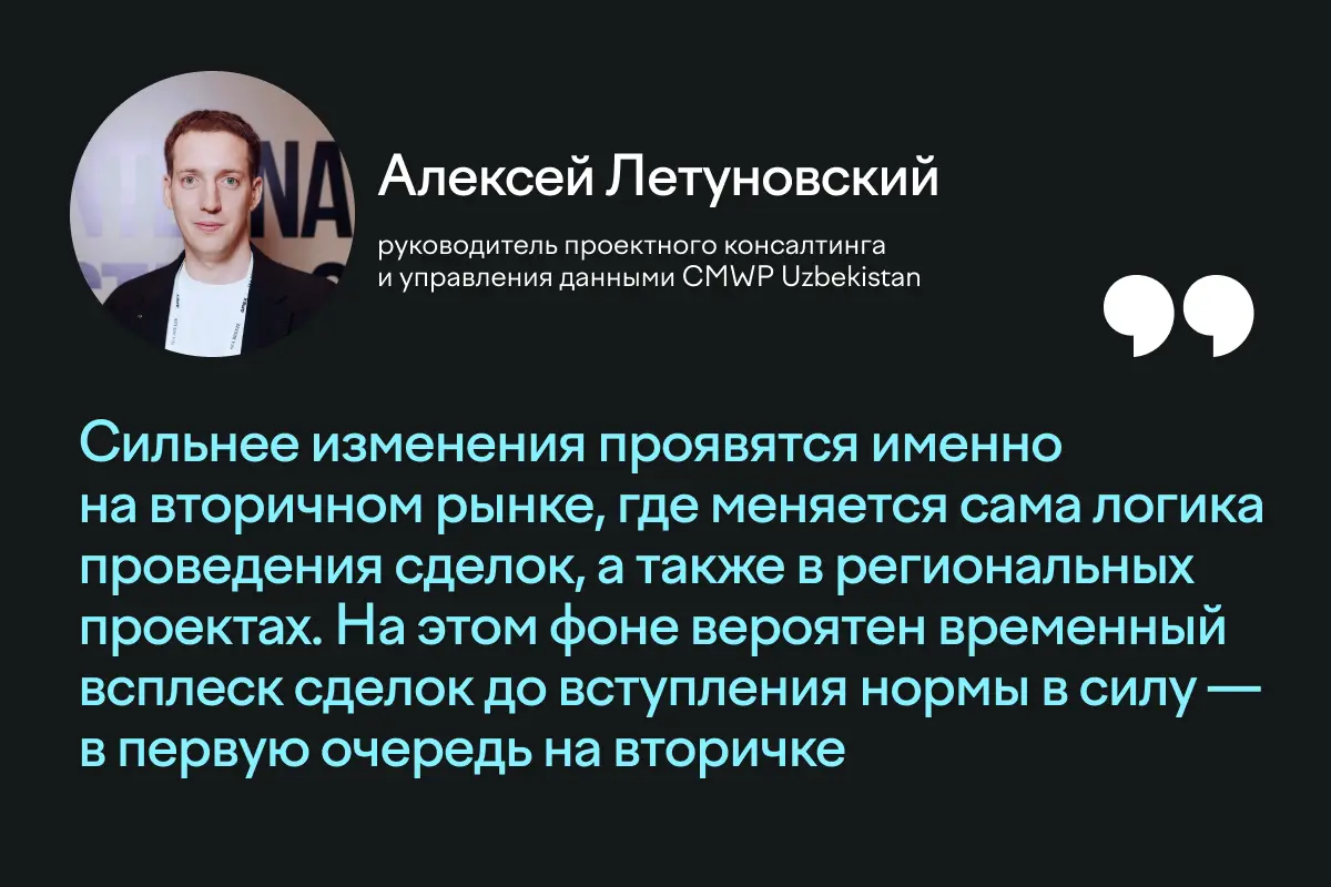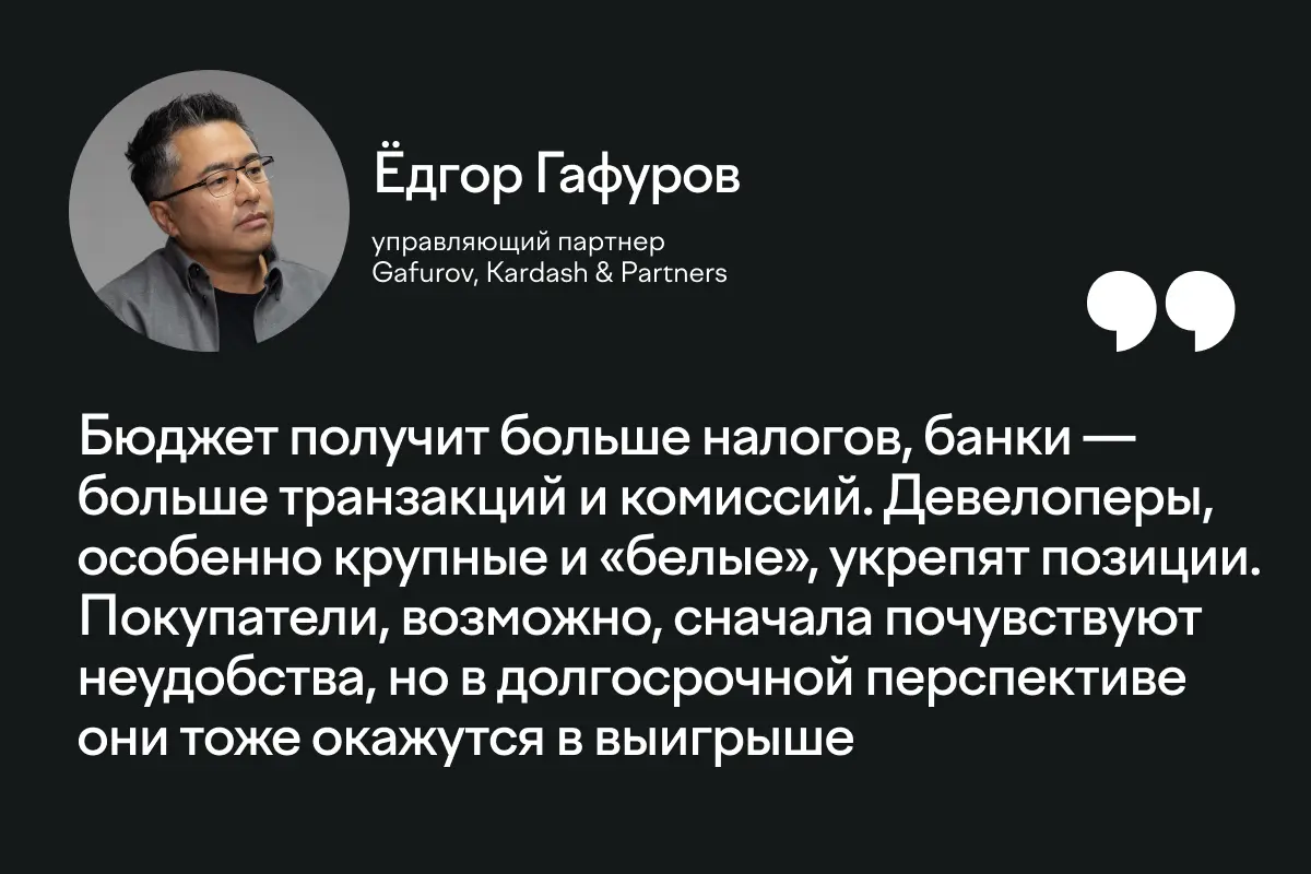 Как отмечает руководитель проектного консалтинга и управления данными CMWP Uzbekistan Алексей Летуновский, косвенное влияние на стоимость возможно через комиссии, фискальную нагрузку и удорожание сопровождения сделок. Но этот эффект, скорее всего, будет ограниченным и растянутым во времени. Он также обращает внимание на практику скидок, которые ранее зависели от формы оплаты: если такие модели пересматриваются, часть покупателей может заметить разницу.