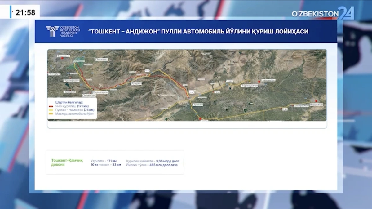 По его словам, платная трасса Ташкент — Андижан общей протяженностью 314 км является одним из крупнейших стратегических проектов в Узбекистане. На первом этапе планируется строительство участка длиной 171 км на перевале Камчик по маршруту Ташкент — Ангрен, из которых 33 км приходятся на 10 тоннелей на перевале Камчик.
