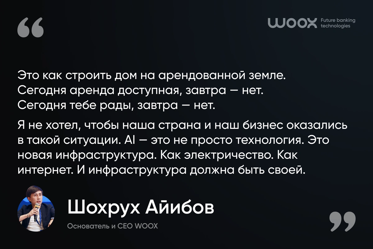 «Это как строить дом на арендованной земле. Сегодня аренда доступная, завтра – нет. Сегодня тебе рады, завтра – нет. Я не хотел, чтобы наша страна и наш бизнес оказались в такой ситуации. AI – это не просто технология. Это новая инфраструктура. Как электричество. Как интернет. И инфраструктура должна быть своей», – поделился Шохрух Айибов, основатель и CEO WOOX.