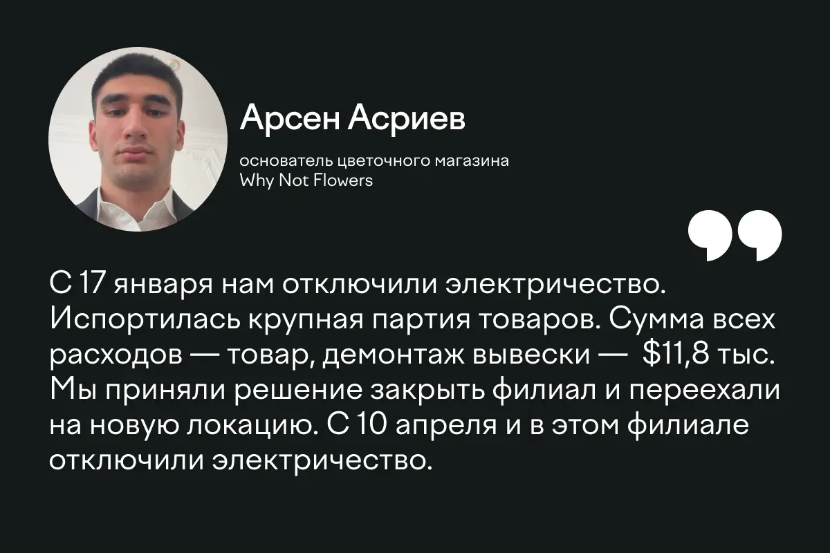 Spot снова поговорил с бизнесом про демонтаж вывесок. Рынок работает без них уже месяцами, теряет до половины клиентского потока и сталкивается с отсутствием понятных правил. Цветочный магазин Why Not Flowers потерял $11,8 тыс. и закрыл филиал на Боткина. С 17 по 22 января в магазине отключали электричество — поставка цветов на $3 тыс. полностью испортилась. Кондитерская Tortele зафиксировала падение клиентопотока на 50% после демонтажа.