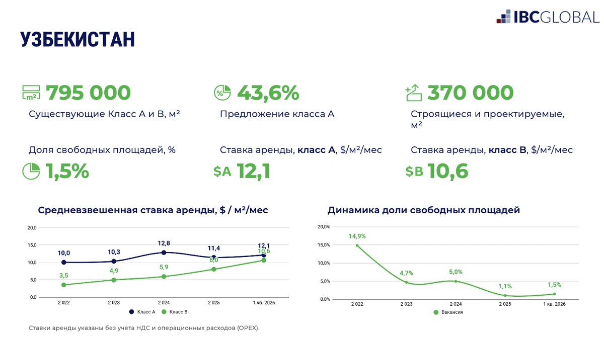 Складской рынок Узбекистана на данный момент является одним из самых дефицитных в мире. По данным, представленным IBC Global, совокупный объем предложения качественных складов классов, А и В в стране составляет 795 тыс. кв. м. В регионе фиксируются растущие ставки аренды (порядка $12 за кв. м в месяц, а в классе В — $10,6 за кв. м в мес без ОРЕХ и НДС что выше ставок в Нью-Йорке), острый дефицит качественного предложения — сейчас нехватка качественной складской инфраструктуры составляет почти 400 тыс. кв. м). Доля класса, А достигла 43,6% и продолжает расти. Вакансия в сегменте, А на уровне математической погрешности 1,5%, что является классическим «рынком арендодателя» с вымыванием предложения площадей на стадии проектирования.